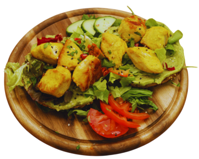 Bagel mit hausgemachter Avocado-Minze-Creme, gemischtem Salat und Hähnchen.